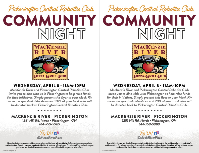 Join us at MacKenzie River in Pickerington for a Community Night supporting Pickerington Central Robotics! Simply present the flyer linked below to your server and Mac River will donate 20% of your food sales right back to Pickerington Central Robotics.